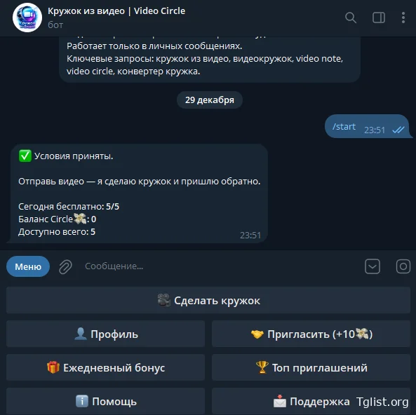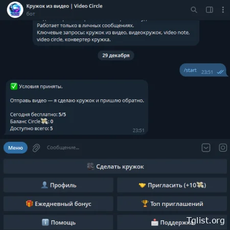 Хотите быстро сделать кружок из видео в Telegram (видеосообщение в круглом формате)? Это можно сделать за пару шагов: отправляете обычное видео — бот превращает его в видео в кружок и присылает обратно. Ниже — понятная инструкция со скриншотами, какие видео подходят и что делать, если “кружок из видео тг” не получается.